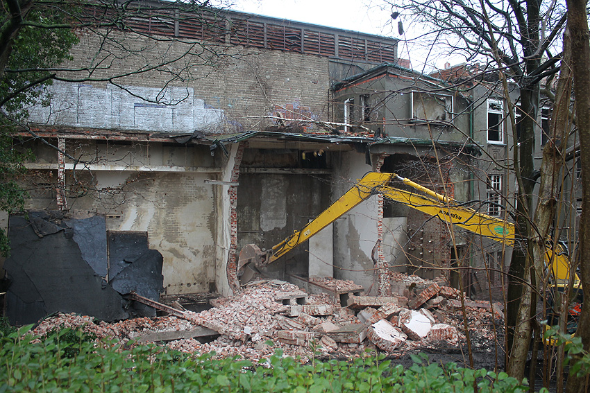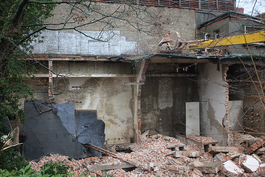 03.12.14: Südzentrale: ABRISS. Heute wurde - wie befürchtet - mit dem Abriss begonnen bzw. der seit Monaten schleichend laufende Prozess der Zerstörung wurde fortgesetzt. Der kleine Anbau nördöstlich an der Maschinenhalle wurde bis auf den Erdgeschosssockel vernichtet. Danach wurde das Unterfangen jedoch wieder gestoppt. Scheinbar sollen nächste Woche noch einmal Gespräche zwischen Verein und Eigentümern stattfinden. Ist das nun das Ende der Südzentrale? In der Tagespresse - Südzentrale: Abriss vorerst gestoppt