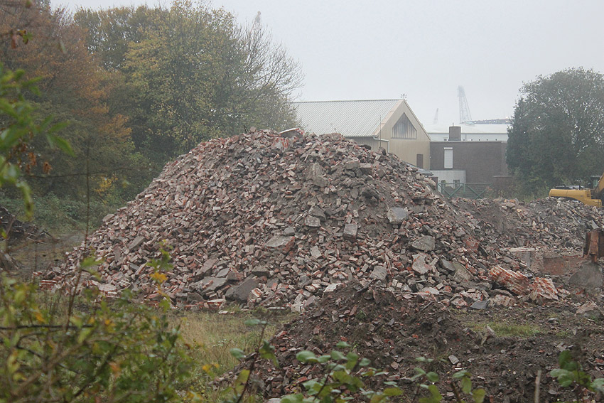 28.05.18: Die Schuttbeseitigungsmaßnahmen sind wieder aufgenommen worden... Nun steht sogar eine Brechmaschine zur Trümmerzerkleinerung auf dem Gelände. Wir berichten hier weiter.