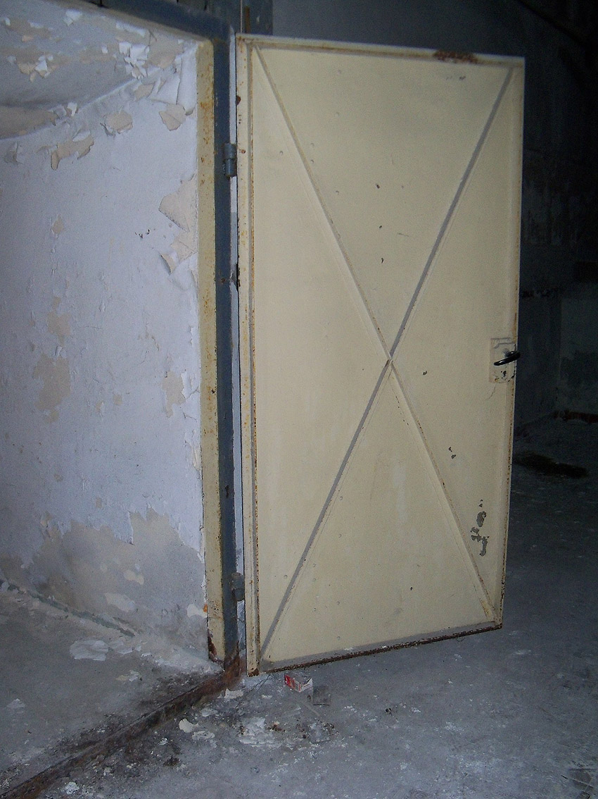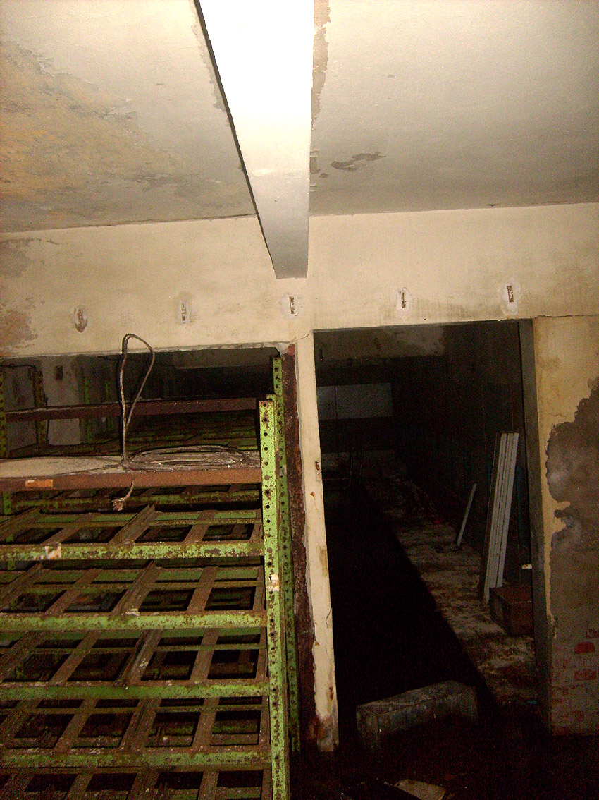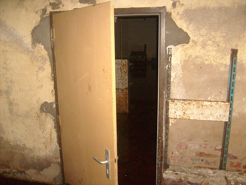 Blick durch die oben erkennbare rückwärtige Tür in den dortigen nach links verlaufenden Vorkeller und den ehemaligen LS-Raum selbst. Dort im Hintergrund links ist wiederum der oben abgebildete Hauptzugang erkennbar: