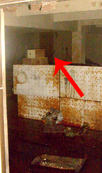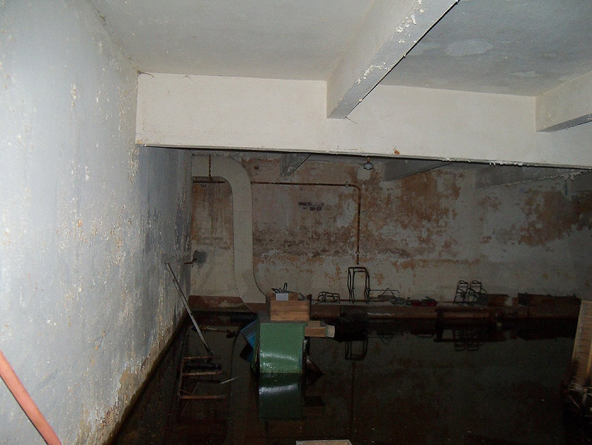 Beachtlich sind die beiden mit Beton umkleideten / verstärkten Stahlträgersäulen. Diese Maßnahme geschah, um dem Raum weitere Stabilität zu verleihen. Hinten links befindet sich der zweite, rückwärtige Eingang in den Keller. Dies wird der ehemalige Notausgang gewesen sein. Er führt fast direkt in das Erdgeschoss des Wohntraktes / Bürotraktes. Dort sind allerdings keinerlei LS-Spuren (mehr) erkennbar...